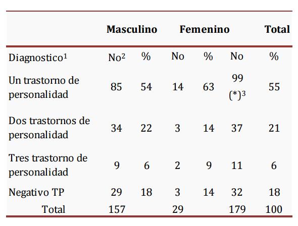 En la tabla 1 se aprecia la distribución de las personas estudiadas; según el diagnóstico, el sexo y el rango de edad, de un total de 179 personas evaluadas; 99 (55%) correspondían a un solo TP. Mientras que 37 (21%) se le diagnosticaron dos, de igual forma, 11 (6%) cumplieron con los criterios de diagnósticos para tres TP y el 18% restante (32) no presentaron trastornos de la personalidad, pero, son sujetos que cometieron algún tipo de delito agravado, tal como lo menciona la APA: (2002) “…Además, es frecuente que los individuos presenten al mismo tiempo varios trastornos de la personalidad pertenecientes a grupos distintos…” (APA, 2002: 646).