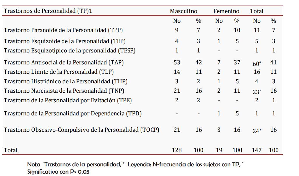 En la tabla 2, se aprecia la frecuencia de los distintos tipos de trastornos de la personalidad según el sexo, predominando el género masculino. Del total de 147 de los internos es el [TAP] el más frecuente con 60 internos (41%). Le sigue el [TOCP] con 24 internos (16%) y el [TNP] con 23 internos (16%).