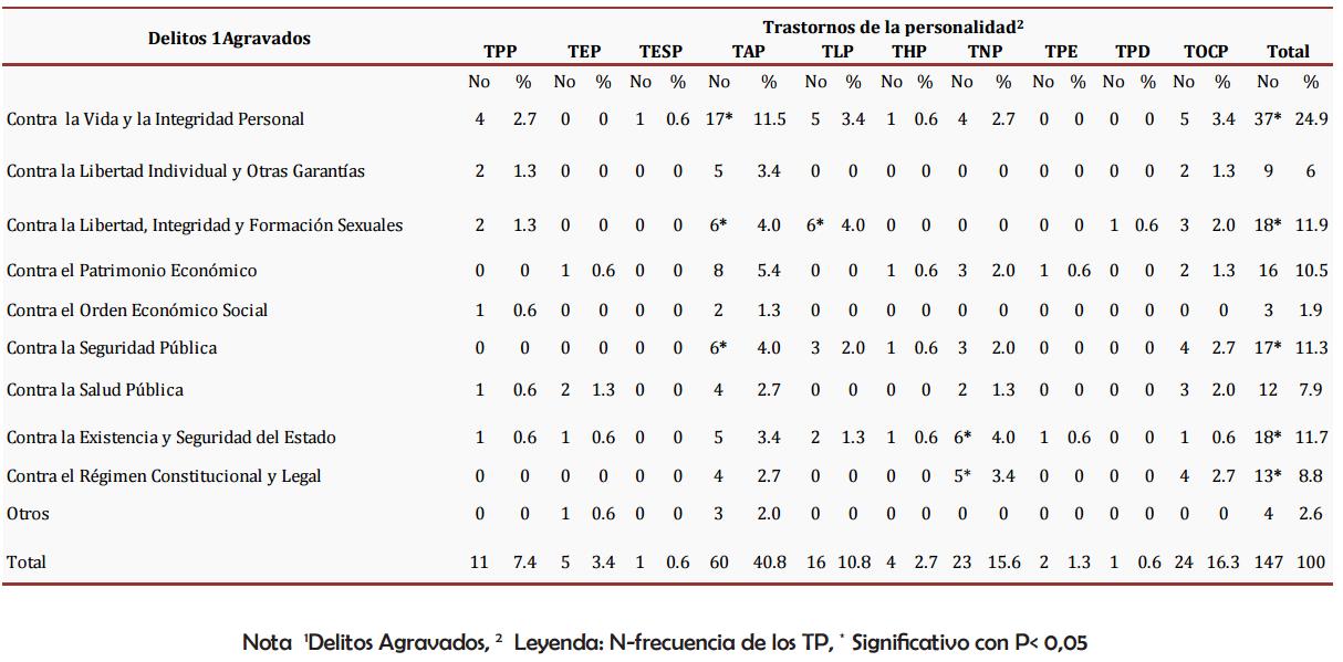 Las personas que han realizado delito contra la libertad, integridad y formación sexuales, en los cuales se incluyen; actos sexuales abusivos y violación (Acceso carnal violento). Dentro de este grupo de delito es común encontrar los TTPP antisocial y límite. Entre tanto, las personas que han cometido delito contra la existencia y seguridad del Estado, estarían relacionados los TTPP narcisista y del trastorno antisocial, teniéndose como indicador especifico el trastorno narcisista como líderes de bandas criminales. El delito contra la seguridad pública, en los cuales se incluyen: el concierto, el terrorismo, las amenazas y la instigación para delinquir y el del peligro común o que puede ocasionar grave perjuicio para la comunidad y otras infracciones. Entendiéndose que estos delitos estarían asociados a los TTPP antisocial, seguido del obsesivo compulsivo y límite de la personalidad. En cuanto al delito contra el régimen constitucional y legal, encontrándose los TTPP narcisista, antisocial y obsesivo-compulsivo.