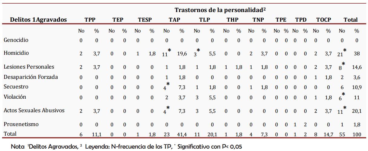 Los resultados del estudio resaltan los delitos agravados y su comparación con los distintos trastornos de la personalidad, en donde las personas que han realizado delito contra la vida y la integridad personal en los cuales se incluyen: