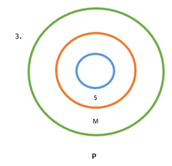 Adicional a lo anterior, en los argumentos silogísticos la conclusión se deriva completamente de las premisas. Esto es, dadas las premisas la conclusión necesariamente se sigue de ellas. Ello, porque en este tipo de argumento, la conclusión está plenamente contenida en las premisas, así que, dadas las premisas, la conclusión se infiere necesariamente. En un argumento silogístico no puede ser que se acepta que sus premisas son verdaderas, que la conclusión se deriva de ellas, pero que la conclusión es falsa. Si las premisas son verdaderas y la conclusión se deriva completamente de las premisas, la conclusión también es verdadera. Esta propiedad de que la conclusión se deriva completamente de las premisas puede verse mejor representada en un gráfico. Tomemos la forma silogística del argumento anterior y representemos cada uno de los términos con círculos:
