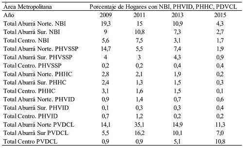 Para el caso del área metropolitana del Valle de Aburrá la unión de los 10 municipios ha logrado reducir el porcentaje de las NBI a un solo dígito. En otras palabras, para el caso de Medellín en el 2015, menos del 1,7% de los hogares poseen NBI. Dato altamente significativo sí se toma en cuenta que el 65,24% de la población total del Valle de Aburrá vive en éste municipio. Del 2009 al 2015 tanto en el Aburrá Norte como Sur el porcentaje de familias con NBI se redujo en más de un 300% (Ver Tabla 2).