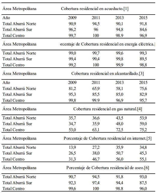En el área metropolitana muy pocas viviendas adolecen de servicios públicos de acueducto, alcantarillado, aseo y energía eléctrica. El 95% de las familias del área urbana y el 85% del área rural, disfrutan de calidad en el suministro del servicio (Ver Tabla 3). Para el 2015 en servicio de internet y gas natural un poco más del 50% de las familias disfrutan de dicho servicio domiciliario. Si bien en el cubrimiento de internet se deja a un 50% de la población sin acceso domiciliario, este es parcialmente cubierto con el internet gratuito que ofrece la administración pública, disponible en los principales parques públicos de toda el área metropolitana, Parques Bibliotecas, centros educativos y universidades. También el mercado, ofrece servicios gratitos de internet en centros comerciales, almacenes de cadena y de telefonía móvil.