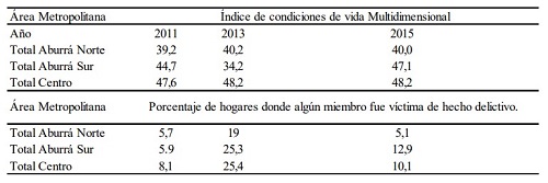 El índice de condiciones de vida multidimensional, Tabla 4, se diferencia del ICV, Tabla 3, en que el ICVM toma en cuenta las diferentes características relacionadas con aspectos internos de condiciones de vida del hogar y de su entorno, tales como la seguridad, el medio ambiente, el transporte y el número de muertes violentas por familia, entre otros. En seguridad, el ICVM toma en cuenta, por ejemplo, si algún miembro de la familia fue víctima de hechos delictivos, tales como carterismo, atraco, amenazas, hurto a residencias, a vehículos, a comercio, a empresas, cobro de cuotas o vacunas y/o chantajes, homicidios, accidentes de tránsito, secuestro o raptos de familiares y/o amigos, paseo millonario, robo a cajero electrónico, violencia o maltrato físico familiar, violaciones, estafas o fraudes.