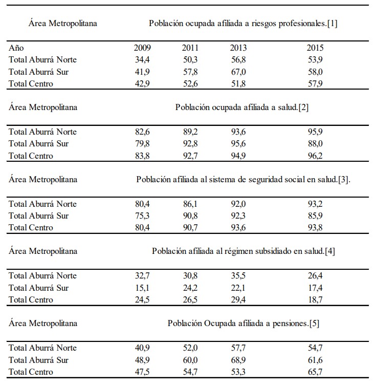 Para terminar, más del 60 % de la población ocupada en el área metropolitana está afiliada a pensiones y más del 50 % a riesgos profesionales. Indicadores que si bien son buenos en relación a los del resto del país, deben de ser mejorados al 100 %. Las cajas de compensación como Comfama crearon el subsidio al desempleo, para personas cabezas de hogar, con más de dos hijos y que lleven un año o más sin empleo.