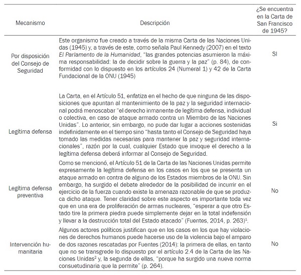 No obstante, en el marco de la ONU se establecieron, también, dos casos excepcionales en los que puede recurrirse al uso de la fuerza, o lo que es lo mismo, en los que la guerra estaría permitida: cuando se hace por disposición del Consejo de Seguridad o cuando pueden invocarse los elementos constitutivos de la legítima defensa. Así mismo, por fuera de estos casos excepcionales en los que la institucionalidad de la ONU permite recurrir al uso de la fuerza, autores como Ximena Fuentes (2014) ponen de manifiesto que algunos Estados han alegado la necesidad de hacer uso de la violencia sin necesidad de sobrepasar los límites formales. La legítima defensa preventiva y la intervención humanitaria.