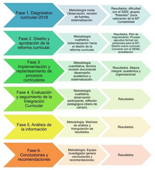El proceso de integración curricular está enmarcado en la rigurosidad, como requieren todas las dinámicas educativas y pedagógicas, bajo parámetros científicos, para ello se establecieron seis fases articuladas a los objetivos de la investigación y cada una tuvo su propia organización metodológica (figura 2).