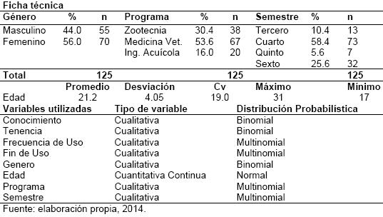 Para el análisis estadístico de los datos,se empleó el método multivariado de la varianza manova con contraste canónico ortogonal, estableciendo la dimensionalidad de la comparación multidimensional, por medio del criterio de máxima verosimilitud observando el mayor valor propio significativo, el estudio se efectuó con variables respuestas de tipo cualitativo expresadas en porcentaje. El análisis se complementó por medio de distribuciones de frecuencia de tipo univariado y bivariado mediante tablas de contingencia, empleando la técnica Chi-Dos a fin de determinar la relación estadística entre las variables cruzadas. Se empleó el paquete estadístico SAS versión 8.2.La siguiente ficha técnica ilustra la caracterización de la muestra utilizada para el estudio.
