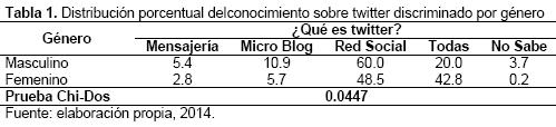 Frente a los conocimientos, 98% de los estudiantes indagados, afirma saber que es twitter. Sin embargo, solo 8% de ellos, tiene claridadque es un servicio de microblog; 74% lo asocia con una red social y 16% con un programa para efectuar mensajería. Se detectó una relación significativa entre el género y el conocimiento sobre lo que es twitter (p<0.05); los hombres tienen un mayor nivelpráctico de esta herramienta (Tabla 1).
