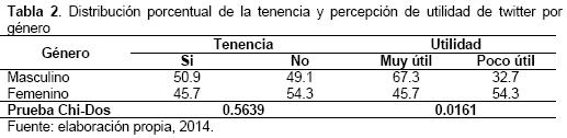 Al realizar el cruce de variables asociadas con el género y la percepción de utilidad, se detectó una relación significativa (p<0.05); los hombres tienen una mayor percepción de utilidad de twitter en el aprendizaje.No se detectó asociación(p>0.05) entre el género y la tenencia de esta herramienta (Tabla 2).