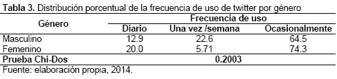 Con respecto a la frecuencia de uso de twitter, 69.8% de los indagados utiliza el servicio de manera ocasional; 13.6% lo utiliza una vez por semana y 16.6% lo utiliza diariamente. No se encontró asociación (p>0.05)entre el género y la frecuencia de uso del twitter (Tabla 3).