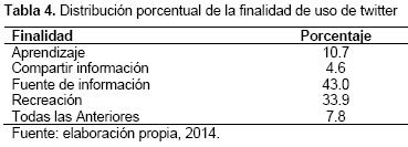 Referente a la finalidad de uso, 43% de los estudiantes indagados utiliza el twitter como fuente de información, 33.9% lo emplea con fines de recreación y solo 10.7% lo utiliza para el aprendizaje (Tabla 4).