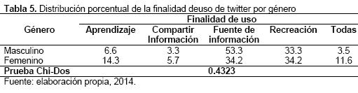 No se detectó una relación (p>0.05)entre el género y la finalidad de uso de twitter. Existe un bajo porcentaje de estudiantes que comparten información por este medio. Cerca del 33% de los encuestados lo emplean para la recreación personal (Tabla 5).
