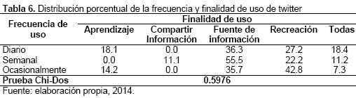 Al relacionar las variables frecuencia de uso y finalidad de uso de twitter, no se detectó relación (p>0.05) (Tabla 6).