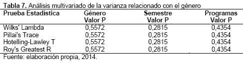 Al efectuar el análisis multivariado de la varianza, no se detectó diferencia estadística entre géneros, entre semestres, tampoco entre programas académicos (p>0.05) (Tabla 7).