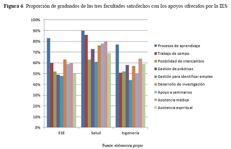 Con relación la satisfacción con el apoyo a los estudiantes se incluyeron aspectos relacionados con los procesos de aprendizaje, trabajo de campo, intercambios, prácticas, investigación, entre otras. En la figura 6, se muestra que el apoyo en procesos de aprendizaje es con el que mayor proporción está satisfecho y el apoyo en la gestión para identificar empleo es con el que menor proporción lo está en las tres facultades. Los graduados más satisfechos con todos los recursos son los de la Facultad de Salud.