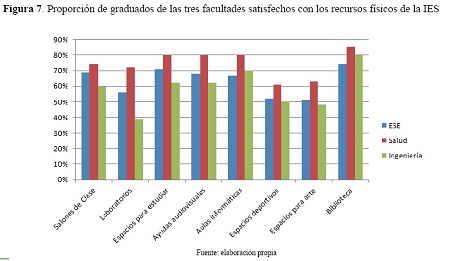 En los recursos físicos se incluyeron los espacios requeridos para la formación integral de los estudiantes. El comportamiento de los graduados satisfechos en las tres facultades es similar, principalmente en la satisfacción con la biblioteca (superior al 75%) y con las aulas informáticas (superior al 67%). La menor proporción de graduados satisfechos la tiene los espacios deportivos y para arte, con menos de un 60%. Se evidencia que los graduados de la Facultad de Salud son, en términos generales, los más satisfechos con los recursos físicos (figura 7).