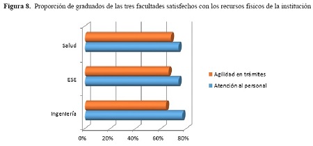 Con relación a la satisfacción con la gestión administrativa se evidencia en la figura 8 que cerca del 80% de los graduados de las tres facultades está satisfecho con la atención al personal, y en un porcentaje menor (por debajo del 70%) con la agilidad en los trámites.