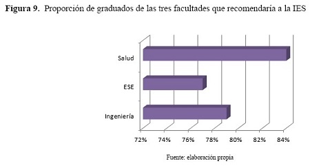 El nivel de identidad con la institución se indagó desde preguntas relacionadas con la recomendación que harían los graduados a otros bachilleres, la opción de volver a la institución y las razones para regresar o no. Con relación a la opción de recomendación de la universidad a otros bachilleres, se encontró que entre el 75% y el 85% de los graduados de las tres facultades sí recomendarían a la IES, principalmente con casi un 85% los graduados de la Facultad de Salud, como se muestra en la figura 9.