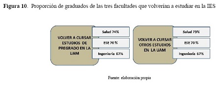 A la pregunta, si volvería a estudiar en la IES, se evidencia en la figura 10, que porcentajes superiores al 67% de los graduados de las tres facultades si volverían.
