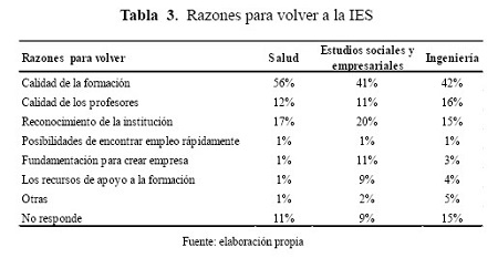 Con relación a las razones de los graduados para volver a la universidad, se encuentra que más del 41% de los graduados de las tres facultades volverían a la institución por la calidad en la formación, y solo un 1% lo harían por las posibilidades de encontrar empleo, como se muestra en la tabla 3. De manera representativa entre el 15% y el 20% volverían por el reconocimiento de la institución.