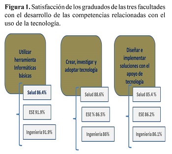 Las competencias se agruparon por áreas relacionadas con: el uso de la tecnología, la comunicación oral y escrita, el manejo de la información y las actitudes frente al trabajo. Con respecto al uso de la tecnología se evaluaron la capacidad para utilizar herramientas informáticas básicas, crear, investigar y adoptar tecnología y diseñar e implementar soluciones con el apoyo de la tecnología. En la figura 1 se observa que en esta área un porcentaje superior al 85% de los graduados está muy satisfecho. La utilización de herramientas informáticas básicas es la de mejor calificación en las FESYE y FI.