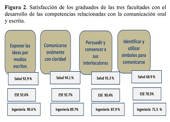 Las competencias relacionadas con la comunicación oral y escrita son la capacidad para exponer las ideas por medios escritos, comunicarse oralmente con claridad, lograr persuadir a los interlocutores e identificar y utilizar símbolos para comunicarse. Frente a esta área, tal como se muestra en la figura 2, la competencia de utilizar símbolos para comunicarse es la que menor satisfacción genera entre los graduados de las tres facultades.