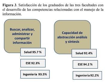 Frente al manejo de la información se incluyeron las competencias de buscar, analizar, administrar y compartir la información y la capacidad de abstracción, análisis y síntesis. El comportamiento del nivel de satisfacción con estas competencias se muestra en la figura 3, en la que se hace evidente que por encima del 92% de los graduados de las tres facultades están satisfechos con el nivel de desarrollo de estas competencias; cerca del 96% de los participantes de la Facultad de Salud están satisfechos con la capacidad de administrar, analizar y compartir información y por encima del 94% en la facultad de ESYE, con la capacidad de abstracción, análisis y síntesis.