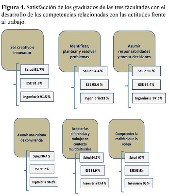 En el área de actitudes frente al trabajo se indagó sobre el nivel de satisfacción con las competencias de ser creativo e innovador, plantear y solucionar problemas, asumir responsabilidades, tomar decisiones, cultura de la convivencia, aceptar las diferencias y comprender la realidad que lo rodea. Frente al nivel de satisfacción con estas competencias, se evidencia en la figura 4 que por encima del 92% en las tres facultades está muy satisfecho con estas competencias. Nótese que el mayor porcentaje de satisfacción lo tiene la competencia de asumir responsabilidades y tomar decisiones, en más del 97% de los graduados y la que reporta una menor satisfacción es la relacionada con la creatividad e innovación.