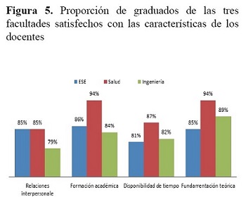 Más del 80% de los graduados de las tres facultades está satisfecho con las características de los docentes. Valores superiores al 84% de los graduados en las tres facultades reconoce en sus docentes la formación académica y la fundamentación teórica, con un porcentaje mayor del 94% en los graduados de la facultad de salud. Un 90% de los graduados de la Facultad de Salud está satisfecho con las cuatro características de los docentes, y de manera similar un 84% de los de la Facultad de Ingeniería y ESYE.