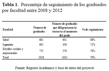 Como se muestra en la tabla 1, participaron 1613 graduados entre el año 2008 a 2012, con un 79% de representatividad frente al 100% de graduados de las tres facultades. La facultad con mayor porcentaje de seguimiento fue la facultad de salud con un 88%.