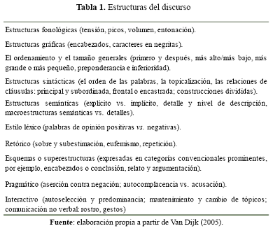 En cuanto a la estructura del discurso, Van Dijk (2005) parte del contenido semiótico y sintáctico del discurso como elementos centrales (una semántica discursiva), ello en medida que la coherencia del texto está definida por dichas características. Pues aún cuando podamos dar cuenta de algunos elementos propios del contexto del discurso, es necesario exigir del análisis una formulación más clara de tales instituciones, y también especificar qué expresiones o significados del discurso dan lugar a qué clase de inferencias u otros procesos mentales. En suma las estructuras se pueden organizar como se muestra en la tabla 1