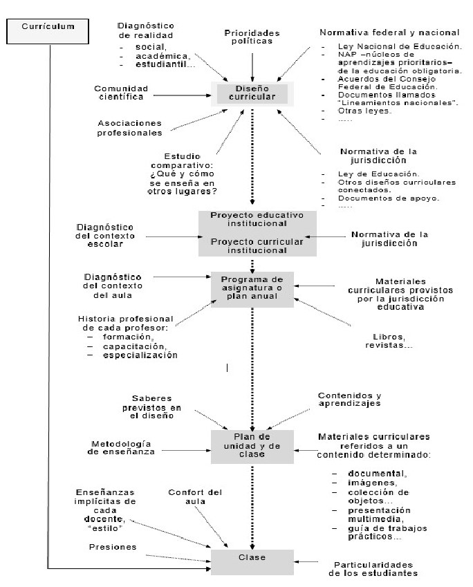 [2] En la República Argentina existen NAP Núcleos de Aprendizajes Prioritarios- acordados para todo el país; los diseños curriculares de cada jurisdicción educativa se ajustan a estos NAP. Por otra parte, en un nivel más contextualizado de concreción curricular, cada institución desarrolla el proyecto de la escuela en algunas provincias /jurisdicciones educativas se lo denomina PEI- proyecto educativo institucional, con sus prioridades y sus distinciones; como componente de ese proyecto, los acuerdos que los profesores realizan acerca de los contenidos y de cómo enseñarlos están especificados en el proyecto curricular institucional (PCI).